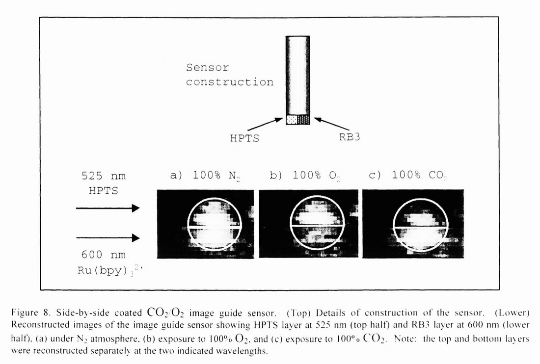 This article describes a dimension reduction technique using a novel 2D to 1D fiber optic array that enables simultaneous acquisition of chemical images at many different wavelengths with high spectral resolution, demonstrated with a CO2/O2 sensor.