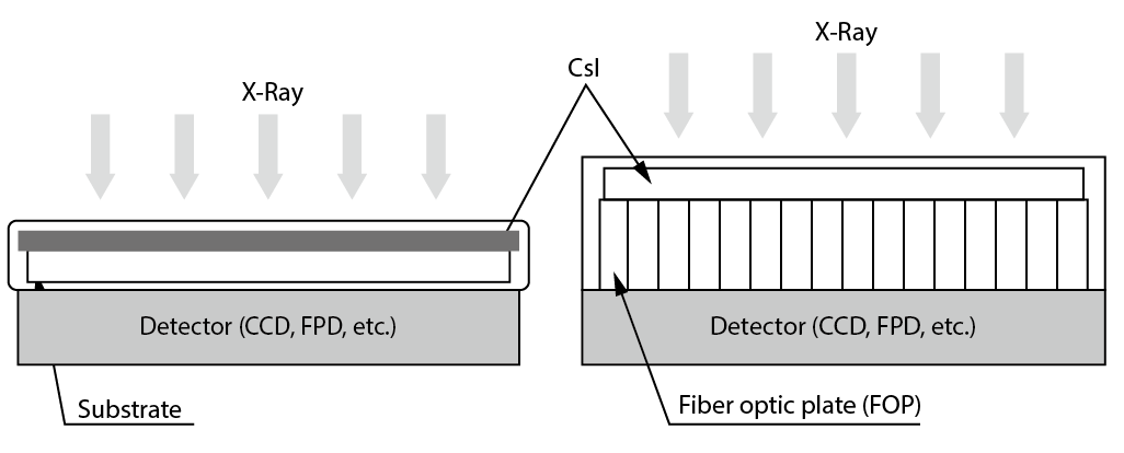 For this reason, light is guided into the crystal wall and a certain fraction is guided into the photodiode direction. These are referred to asstructured scintillators. CsI (Tl) scintillator can be deposited on substrates such as glass, which is then flipped and adhered to the photodiode. It can also be deposited directly on the photodiode or deposited on the fiber optic plate.
