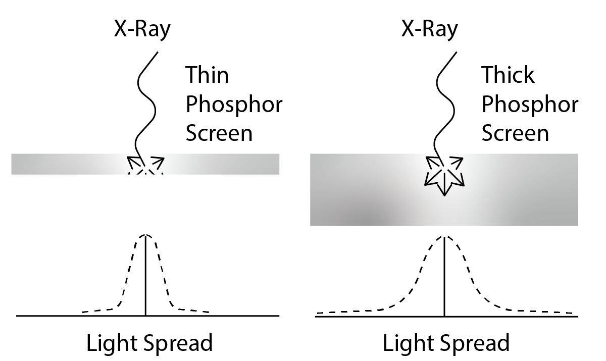 While light travelling within the phosphor, the light will spread—the amount of diffusion being proportional to the path length required to escape the phosphor. X rays interacting close to the photodetector give rise to a sharper (less blurred) optical signal than those which interact more distantly. The paths of most optical quanta will be shortest if the photodetector is placed on the x-ray entrance side of the phosphor.